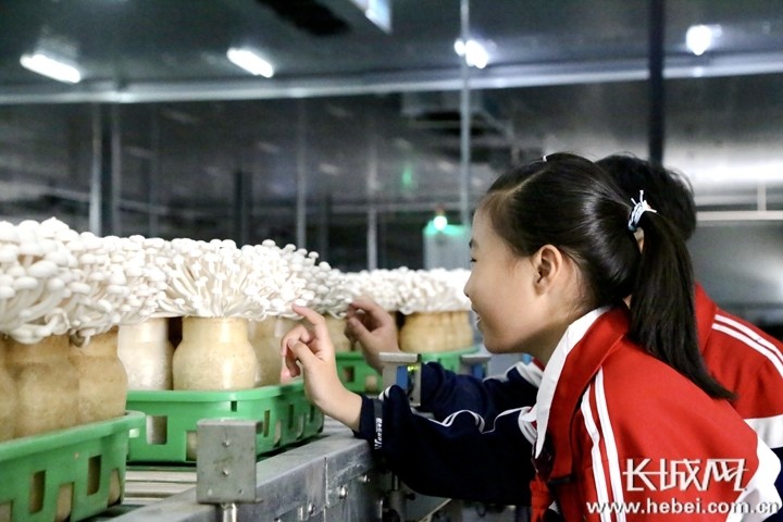 在菌菇展厅、菌菇生育室和包装车间等参观点,讲解员带领学生们了解菌菇的培养和生长过程,感受现代科学是如何将原材料变成成品,进而走出工厂、走进人们的日常生活中。