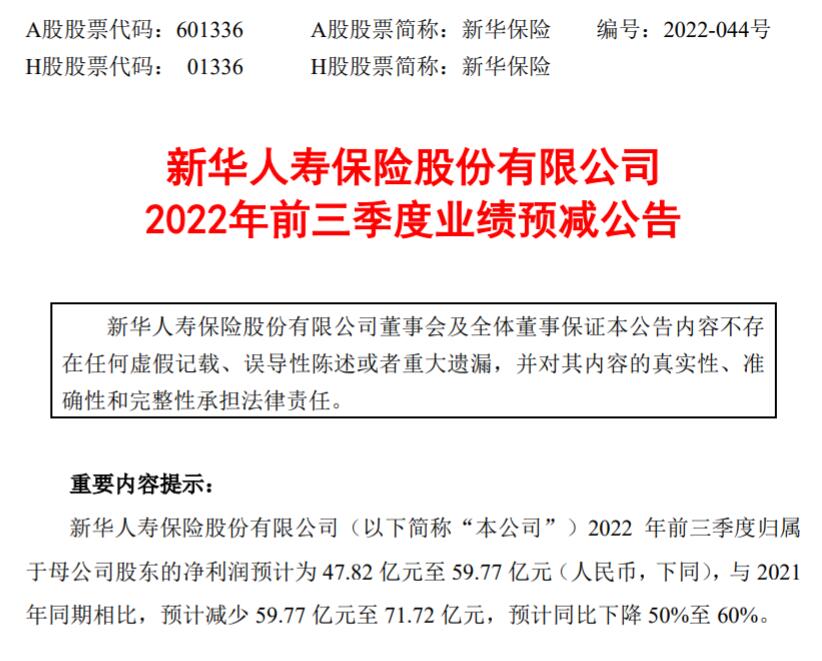 10月24日晚间,新华保险公告,预计前三季度净利润47.82亿元至59.77亿元,同比下降50%至60%。