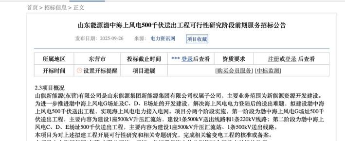 9月26日,山东能源集团发布的《山东能源渤中海上风电500千伏送出工程可行性研究阶段前期服务公开招标项目招标公告》显示,为进一步推进渤中海上风电G场址及C、D、E场址的开发建设,解决海上风电电力登陆后的送出难题,拟建设渤中海上风电500千伏送出工程,实现海上风电电力接入电网。